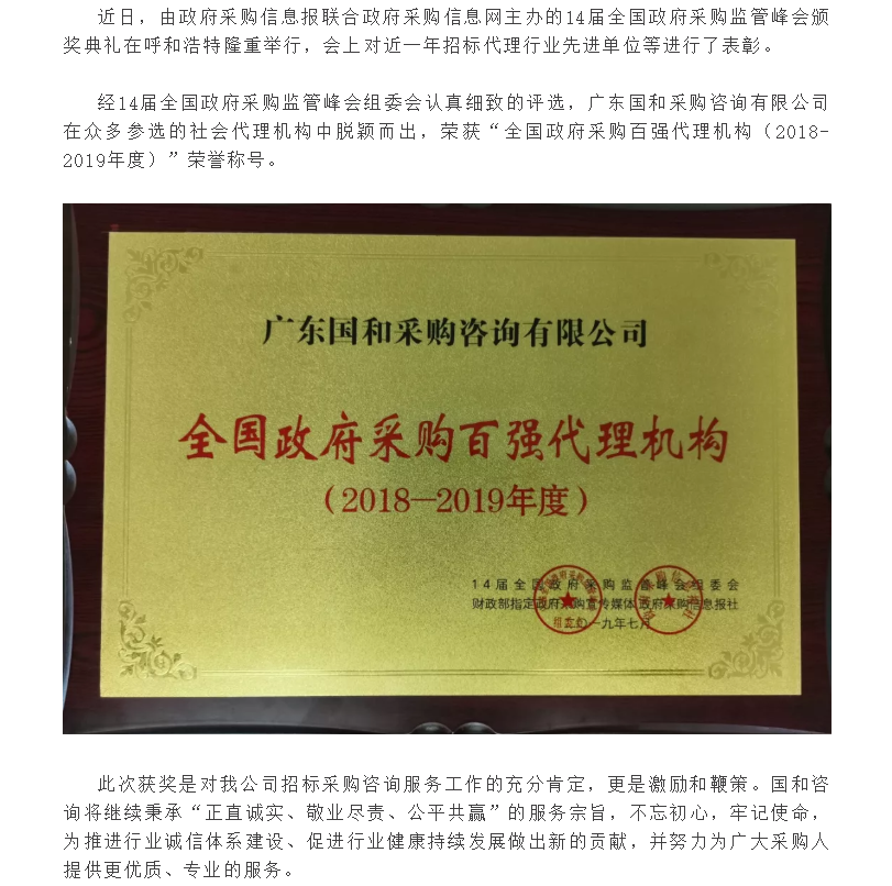 祝賀我公司榮獲“全國政府采購百強代理機構(2018-2019年度)”榮譽稱號