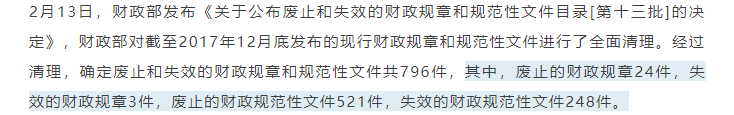 為了適應(yīng)依法行政、依法理財(cái)?shù)男枰?,根?jù)《財(cái)政部規(guī)章和規(guī)范性文件清理工作規(guī)則》,我部對(duì)截至2017年12月底發(fā)布的現(xiàn)行財(cái)政規(guī)章和規(guī)范性文件進(jìn)行了全面清理。經(jīng)過(guò)清理,確定廢止和失效的財(cái)政規(guī)章和規(guī)范性文件共796件,其中,廢止的財(cái)政規(guī)章24件,失效的財(cái)政規(guī)章3件,廢止的財(cái)政規(guī)范性文件521件,失效的財(cái)政規(guī)范性文件248件。現(xiàn)將廢止和失效的財(cái)政規(guī)章和規(guī)范性文件的目錄予以公布。